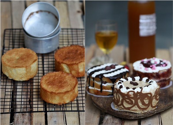 Summary: Dainty little iced cakes lavished with a vanilla buttercream. Each good to serve four, they are made with different flavours – coffee, chocolate & raspberry. The flavour possibilities are endless … and the fun, infinite!
